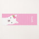 Cute llama yoga mat design featuring a white llama illustration, pink flower and pink polka dot background.
