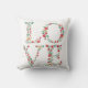 This sweet LOVE pillow features decorative floral letters that spell out LOVE. Each letter has a green vine with bright red flowers. Some of the letters contain an envelope and or a red crown. Colours include green, red and off white. The back a coordinating red colour.