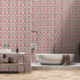 This wallpaper features a floral medallion motif in teal and coral on warm ivory. The repeating ornamental pattern reads vintage boho with subtle damask character, adding movement and an inviting, collected feel. Beautiful for an accent wall or full room in bedrooms, living rooms, entryways, or dining nooks. Pair with natural wood and textured linens for a softly layered look.