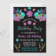 Pretty Mexican Fiesta floral design with bright pink, purple and blue folksy flowers on a black background