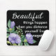 This motivational floral mousepad features a purple flower pattern nestled in green leaves with the quote "Beautiful things happen when you distance yourself from the negative" highlighted against a jet black background.