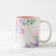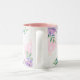 This lovely mug has images of pretty pink, lavender, blue and green flowers and accents all around the face of the mug over white background. Sample interior is shown with pink inside. Change to your choice inside colour.