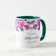 This floral mug has purple and pink roses with emerald sea green leaves around the top edge of the mug over a white background. Purple text waiting for you to personalise. Sample interior shown is green. Choose your colour interior to suit your taste. Customise this mug or buy as designed.