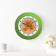 A botanical and homey style, where photo of a group of orange Lily flowers meets the white clock face circle with black dots for all hours but 3, 6, 9 and 12. There is added what appears like a lime green coloured frame.