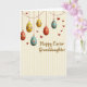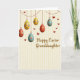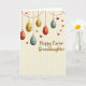 This greeting card features six egg-shaped ornaments hanging from thin red strings that loop gently across the top, like they’re swaying together in a spring breeze 🐰. Each egg is coloured in sunny yellow, rich red, and calm teal, with detailed floral and curling patterns that feel like a thoughtful gift shared between close family or friends. A teal egg near the middle includes a crisp white flower that draws the eye, adding a tender, cared-for touch to the arrangement. Small deep-red butterfly silhouettes drift around the eggs, giving the scene a light, affectionate energy 🐇. Behind everything, soft vertical stripes in warm cream and pale yellow create a cosy backdrop that keeps the focus on the hanging decorations. In the lower right, the message “Happy Easter Granddaughter” appears in a shimmering golden-brown cursive style, set slightly above the bottom edge. The red strings trace a wavy line across the upper area, with the butterflies sprinkled between the eggs against the striped background.