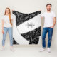 This boho volleyball themed fleece blanket for her features the realistic image of an abstractly oversized volleyball that has black and white panels - a continuous doodle pattern of paislies, flowers and feathers in white covers the volleyball's black panels - personalise with the athlete's name and monogram, varsity letter or jersey number - by katz_d_zynes