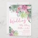 Pink Green Floral Palm Leaves Tropical Wedding Invitation. With pink and green botanical accents and happy pink lettering. A tropical design that embraces the tranquil beauty of nature mixed with a playful edge that is sure to help you have fun. A blend of calming green tropical leaves, including banana leaves, palms, monstera leaves, and pink princessa plants, alongside soothing purple-pink orchid flowers and protea bloom, intertwined with various other foliage. Enhanced by a modern handwritten or script typography font, this enchanting print radiates charm and sophistication. This versatile design brings a sense of tropical paradise to any setting or special occasion, making it perfect for a destination wedding, or just when you want to add a tropical flare.