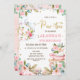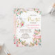 Pretty floral tea party themed birthday invitation featuring a pink rose teapot some cups, biscuits and lovely floral arrangements. The heading is a faux gold calligraphy image that is on a separate layer and is removable.