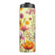 Bright travel tumbler featuring a vivid floral design with spring blooms on a soft yellow backdrop. Cheerful, colorful, and nature-inspired, perfect for lifestyle, home, and gift contexts.