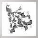 This design features an original illustration of a stylised boho black floral peacock with an elegant tail made up of paisley shapes decorated with flowers.