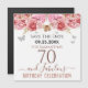 Girly glitter, millennial pink background, with fancy script name typography. Happy 70 and fabulous birthday design template. Pink Roses and butterfly top border. Great for 70th celebrations. Save the date celebration reminder.