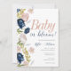 A floral Baby in Bloom invitation featuring pink and navy flowers for gender reveal themed baby shower. This Invite is perfect for gender neutral or reveal baby showers.
