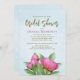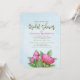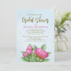This design features a floral botanical elegant pink flower, a bridal shower with pretty peony peonies, a QR code website online URL, a Facebook social media event page, a stylish trendy calligraphy script, a summer bright pink garden flowers, a light blue-green foliage, a modern elegant typography style, a watercolor hand-drawn illustrations, a pretty garden pink floral pattern