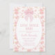 Sweet pink bow and tiny pink floral pattern love shack baby themed baby shower invitation for baby girl also featuring an oval white frame with a pink border.