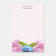 Personalise pretty Hydrangea flower-post-it notes with your own text. This pink note features two pink Hydrangeas and one Nikko blue flower.