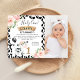 Cute cow themed first birthday invitation for a baby girl featuring a cute black and white cow, a bold black and white cow print pattern and some lovely pink floral roses. This design also features a removable faux gold glitter one on the front of the invitation and a photo on the right hand side.