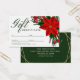 An elegant Christmas floral gift certificate features cursive typography, red poinsettia flowers, red berries, pine cones and greenery leaves, a gold sparkly geometric frame and a dark green background.