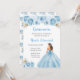 This Quinceanera invitation features a beautiful princess in a blue ball gown with floral arrangements. This is perfect for a Quinceanera birthday party.