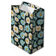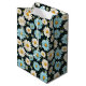 This medium size paper gift bag is shown in a lovely blue and white daisy floral print on a dark colour background.