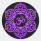 An Aum or Om design sits inside of a stylised lotus flower. The circular pattern is colored with a deep purple that is highlighted to create a light shine on the surface. The background is painted pure black that can be seen through the negative space of the flower. This stylish sticker is a striking representation of this spiritual symbol.