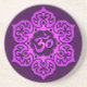 An Aum or Om design sits inside of a stylized lotus flower. The circular pattern is colored with a deep violet that is highlighted to create a light shine on the surface. The background is painted dark purple that can be seen through the negative space of the flower. A shadow appears just beneath the design making it seem to float just above the surface of the coaster. This stylish design is a striking representation of this spiritual symbol.