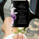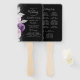 The left-hand edge of this elegant modern wedding program fan features a floral bouquet in shades of purple and lavender, trimmed with silver faux foil and faux glitter foliage and sprinkled with silver faux glitter. The customisable text combines pale silver grey handwriting script, copperplate and italic fonts on a black background.