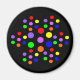 This magnet features a series of spots representing the seven colours of the rainbow, red, orange, yellow, green, blue, indigo and violet. The spots are arranged to for a floral pattern. The seven larger spots form the centre of the flower and six smaller groups of spots form the outer petals resulting in a pretty eye-catching design.