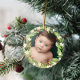 Beautiful floral Christmas ornament with your photo inside a floral berry wreath of sage green greenery, white flowers, and red berries. Add your baby's name and the year on the back.