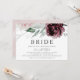 This floral romance horizontal bride bridal shower invitation is perfect for an elegant wedding shower. The modern rustic boho design features romantic watercolor flowers in soft tones of burgundy, mauve, blush pink and cream white with green leaves.