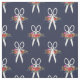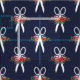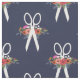 Navy blue fabric with a pattern of flower-adorned white scissors.