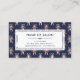A floral appointment card for a hair stylist in navy blue and white with a pattern of white scissors decorated with hand-drawn flower bouquets in orange, pink, and red.