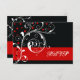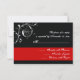 Elegant floral scroll leaf black, red flourish wedding RSVP response/reply card, featuring white scroll leafs, swirls and curls and red dots on black background. There is a red band with your text to the bottom. Classy, stylish and chic design perfect for a winter wedding.