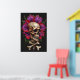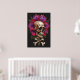 A fusion of life and death, this striking illustration features a hyper-detailed human skull crowned with oversized tropical flowers and framed by crossed bones. The deep charcoal background enhances every petal and crack, letting the vibrant reds and purples shine while anchoring the piece in bold gothic elegance.