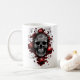 A gothic-inspired artwork blending a detailed skull with vibrant red roses and intricate vine patterns, symbolising the duality of life and death.
