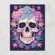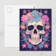 A striking postcard featuring a skull adorned with vibrant flowers and surrounded by stars, perfect for those who appreciate a blend of the macabre and the beautiful.