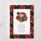 Crimson red, black and gold gothic wedding invitation featuring a skull decorated with red roses and a dramatic rose pattern. The QR code on the reverse directs to your wedding site where people can learn more and rsvp.