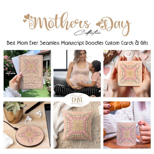 The soft peach backdrop paired with garden-toned greens and pinks makes it a timeless stylish modern Mom Stationery and unique gifts made with intricate Artistry Hand-drawn script turned into a kaleidoscopic masterpiece.