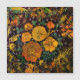 This vibrant image is a combination of a painting and digital art. It features glowing, golden-yellow and orange flowers with intricate, web-like textures. The flowers resemble roses and other blossoms, surrounded by a tangle of neon-like stems and leaves in shades of green, orange, and red. The background is dark, almost black, which enhances the luminous effect of the flowers and foliage. There are also tiny, twinkling star-like lights scattered throughout, adding a magical or cosmic feel.
