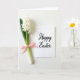This design shows a diagonal bouquet of small white, star-shaped blossoms with faint yellow centers, nestled in rich green stems and leaves, resting on a bright white surface. A soft pastel pink ribbon wraps the stems and forms a simple bow, adding a gentle, affectionate touch like a quiet gift left for a close friend 🌷. The flowers sit to the left, and their natural curves lean toward the open space on the right, as if reaching across the table. On the right side, a white greeting card stands upright, keeping the layout balanced and calm. Across the front of the card, a seasonal greeting appears centered in flowing black lettering, with generous white space around it. Soft, diffused light brings out the petal texture and a slight sheen on the ribbon, with only faint shadows beneath the stems 🐇. The greenery shifts from deep emerald along the leaves to a paler tone near the base, while the card’s crisp edge stays sharply defined against the white background.