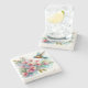 The coasters are gorgeous, a quality feel and heavy weight. They look like a precious archeological find. A rustic stone juxtaposed with a modern floral black and white print. I like the way the print goes slightly imperfect on the cut stone edges giving them a kind-of natural beauty.