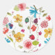 This is an original watercolor by Kristina Anderson, printed on a round sticker. Whimsical and bright, flowers and berries.