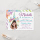Stylish, trendy and chic magical floral watercolor fantasy unicorn themed photo birthday party invitation design in a colour palette of colourful rainbow colours that create a beautiful and magical design. The design features florals and a unicorn illustration. Photo placement where you can place your own photo. The reverse side features a multicolor rainbow watercolor stripe pattern with beautiful watercolor florals that beautifully complements the front artwork. All illustrations contained magical fantasy unicorn photo birthday invitation are hand-drawn original artwork by Moodthology. You can customise the text size, text colour, font and layout for your own personal design preference.