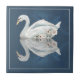 On this tile, a watercolor image of a beautiful white swan floats across a deep blue pond, it's reflection mirrored perfectly. Beside the swan are pale pink flowers. The image is framed with a thin white line. Elegant! Be sure to see the matching products in our store.