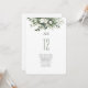 This table number card is adorned with a luxurious bouquet of white roses and an array of green foliage, spanning from soft sage to deep olive tones. It gracefully combines functionality with aesthetic appeal, featuring a prominent table number alongside a list of guest names. The elegant font enhances the sophisticated look of the card, making it a seamless addition to any wedding table setting. The design ensures guests can effortlessly find their seating while being welcomed by the natural charm of the floral arrangement.