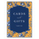 This is a vintage style image featuring an elegant navy blue card with the words "Cards and Gifts" in sophisticated script, surrounded by a vibrant orange background adorned with intricate blue floral patterns. The composition exudes warmth and gratitude, making it perfect for expressing heartfelt thanks. It feels like receiving a thoughtful note on a beautiful day—classic, charming, and full of appreciation.