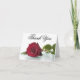 Say thank you with a rose! This charming floral note card features a red burgundy rose flower lying in the rain highlighting a thank you greeting printed in a fancy script font.