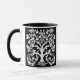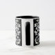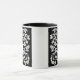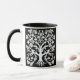 Mug in a stylised, flower and leaf, tree of life design in white on a black background