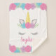 This cute unicorn Sherpa blanket makes a wonderful gift for a girl. Design features a unicorn face and flowers in purple, pink and teal.