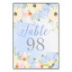 Sweet spring flower bouquet with pink roses, blue hydrangeas, purple and yellow flowers on a watercolor blue background. Elegant modern script typography with delicate swirls elements. Soft pastel shades of yellow, blue and pink are the main colours of this wedding suite.
