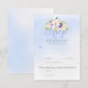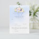 Sweet spring flower bouquet with pink roses, blue hydrangeas, purple and yellow flowers on a watercolor blue background. Elegant modern script typography with delicate swirls elements. Soft pastel shades of yellow, blue and pink are the main colours of this wedding suite. Personalise the text, add wedding information and make this invitation yours.